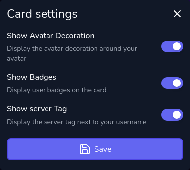 The available settings may vary depending on the card type. For example, the Discord Presence card type has the following settings: