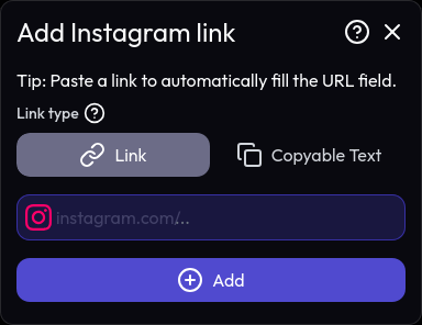 To add links to your profile, go to the Links page of the dashboard. Select the social media platform you want to add a link for, and enter your username or profile URL.